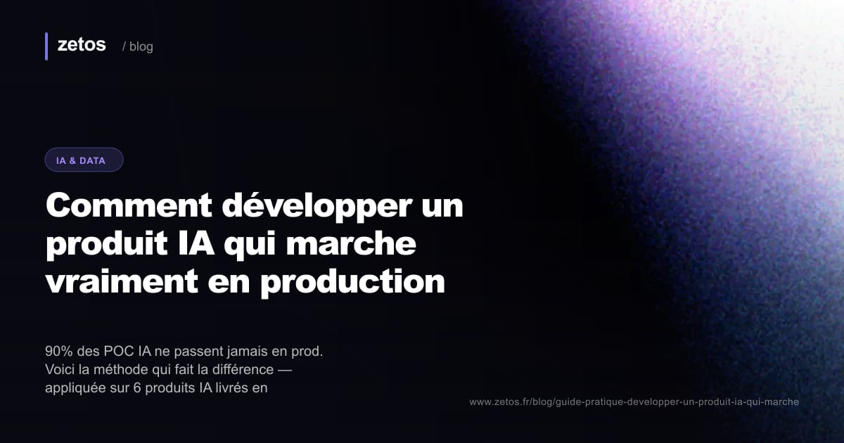 Voici la méthode qu'on applique chez Zetos sur les produits IA, distillée de 6 produits livrés en 2024-2025 (Moriarty, The Patch, CS Consulting et autres).